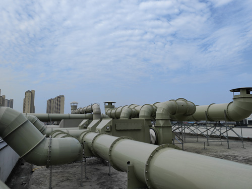 試驗室工業廢氣 → 生物炭吸附器 → 引軸流風機 → 排出